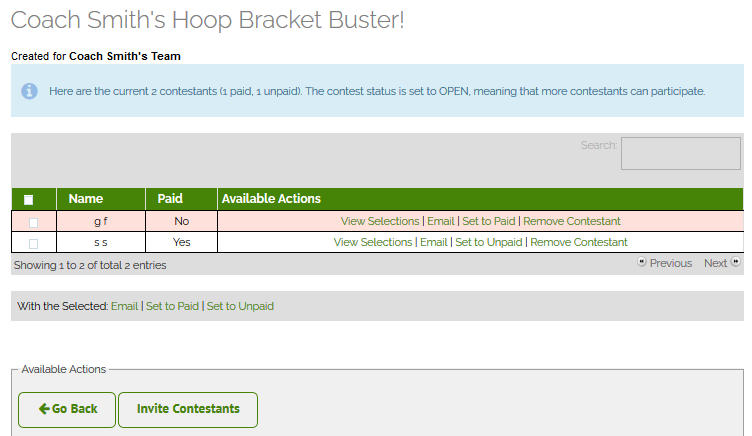 The manager login also keeps all donor statuses front and center, and offers a convenient email contact option to follow up with participants. Members may also email managers directly within their secure logins as well. When a member donates, their status is easily adjusted on the board for all to see, so all stragglers are duly noted! Looks as though there is one straggler in Coach Smith's bracket picks...